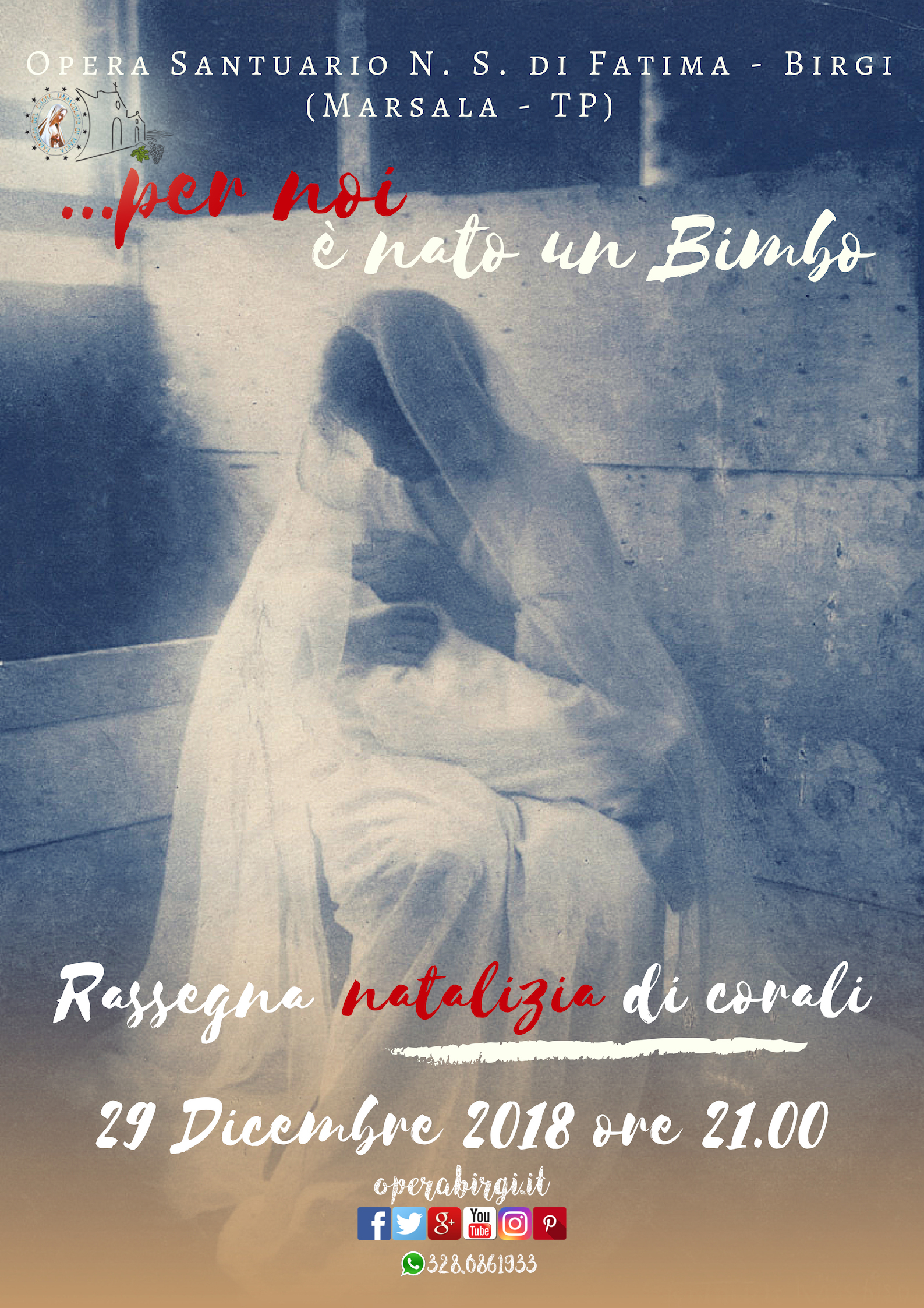 La Famiglia del Cuore Immacolato di Maria è lieta di invitarvi a partecipare alla VII RASSEGNA CORALI NATALIZIA …per noi è nato un Bimbo che avrà luogo presso l’Opera Santuario Nostra Signora di Fatima di Birgi - Marsala, Sabato 29 Dicembre 2018 alle ore 21.00.
