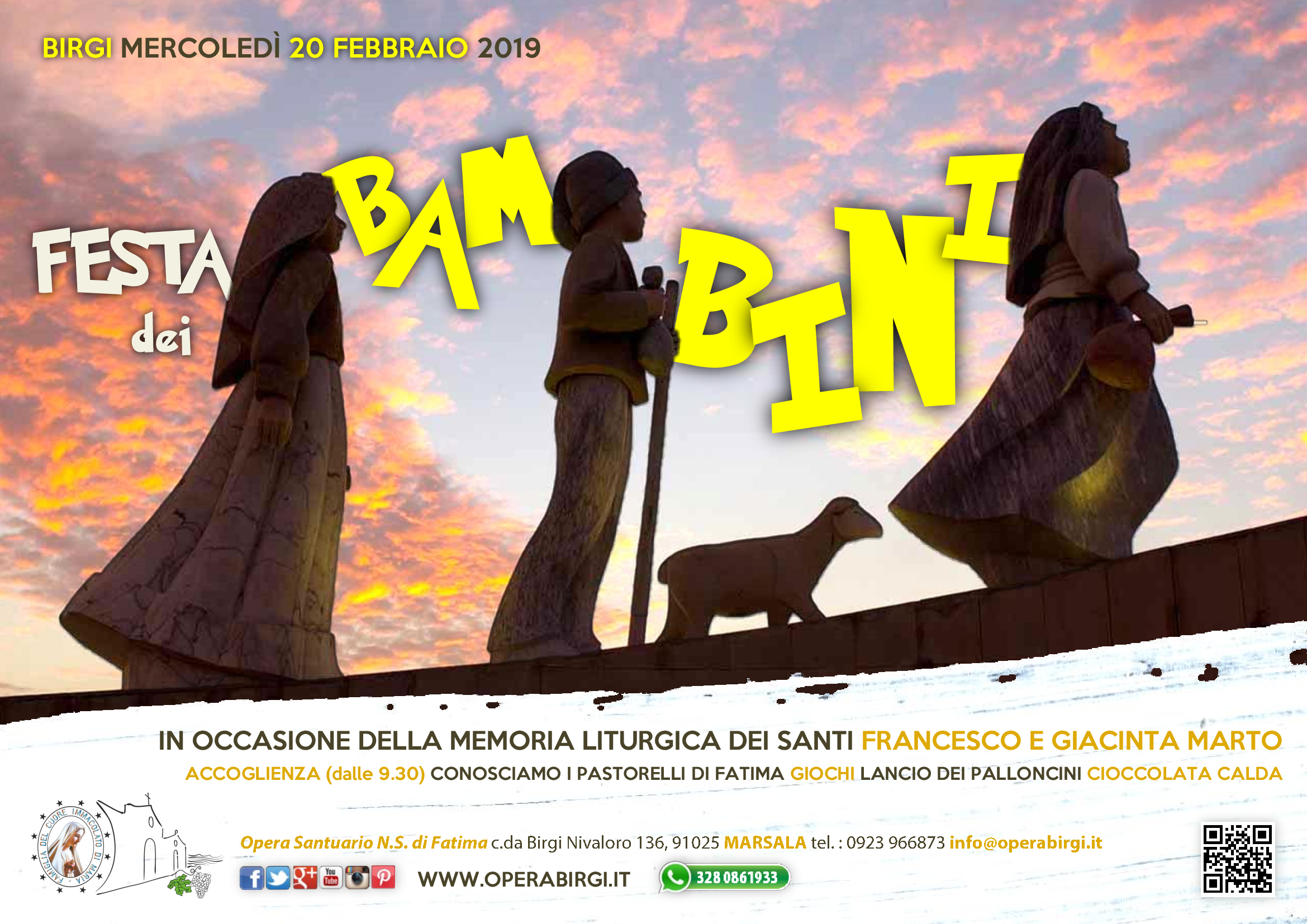 Il 20 Febbraio 2019 si svolgerà, presso l'Opera di Birgi, la "Festa dei bambini": un momento di particolare festa in occasione della memoria liturgica dei Santi Francesco e Giacinta Marto, i Pastorelli di Fatima.